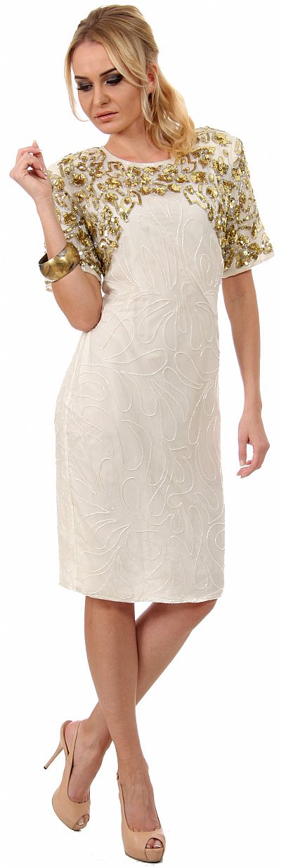 Jacket Style Sequins Knee Length Formal Beaded Dress. Bodice has jacket like floral sequined pattern all around with abstract floral beading at the rest of the dress. Round neck dress has shoulder pads with half sleeves & big keyhole at back. 40" long dress has back zipper closure with small slit at the back. Imported.