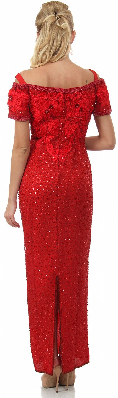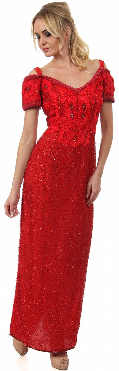 Off shoulder V-Neck Sequins & Ribbons Long Formal Dress. Floral pattern at the front & back of bodice in ribbons & sequins also. Neckline, hemline and short sleeves have broad border in pearl beads. Straps at the shoulder to hold the dress with long slit at the back. Back zipper closure. Silk chiffon with polyester lining. Imported.