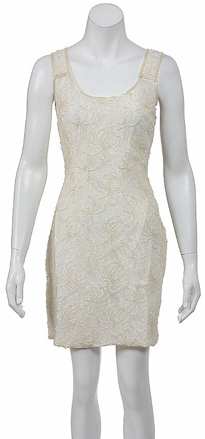 Short Pearl Beaded lace self-print dress. Light weight. Round neck and back. Sleeveless with wide straps. Small slit in the back. Back zipper closure. Imported.