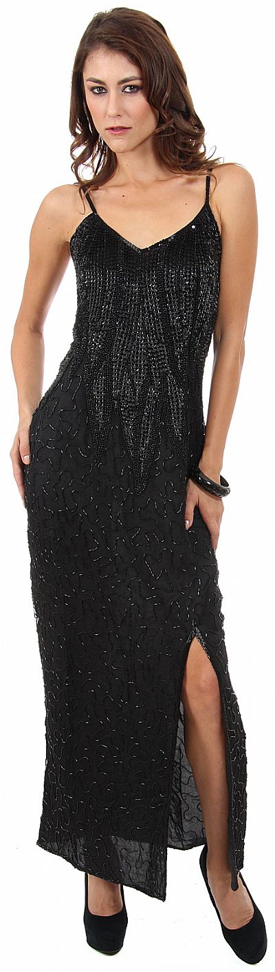 V-Neck Spaghetti Straps Sequined Long Formal Dress with Front Slit. Leafy sequined pattern on the bodice in the front & back also. Long slit in the front on the side. Back zipper closure. Imported.