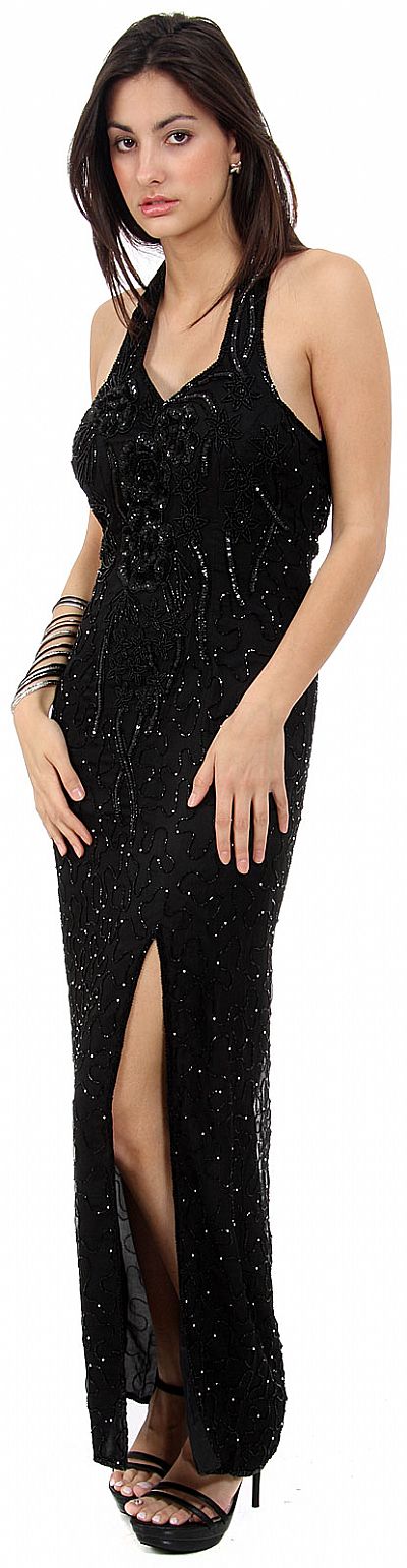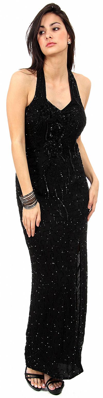 Sequin beaded halter neck formal dress with same colored floral beaded bodice. Open back with zipper closure. Slit on the side in front. 100% Silk chiffon with polyester lining. Imported.
