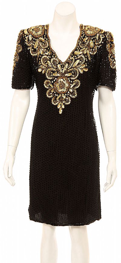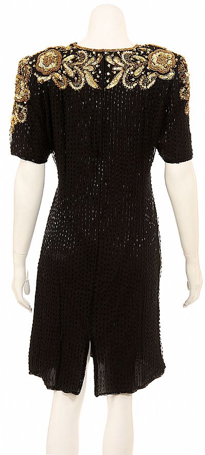 Short dress with short sleeves and V-neckline. Elaborated floral design along neckline, back and sleeves. Fully hand beaded. Shoulder padded and back zipper closure with small slit in the back.