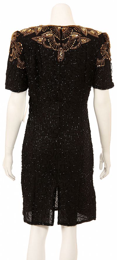 Beaded short formal dress with beaded bodice, shoulders & back of the neck area. Dress has short sleeves & small slit in the back with zipper closure. Imported.