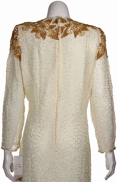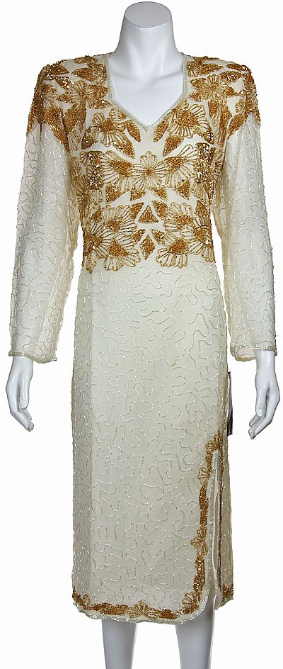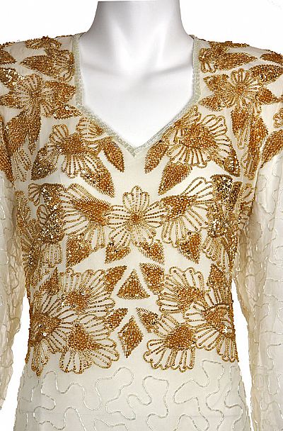 V-Neck Knee Length Beaded Bodice Dress with Full Sleeves & Front Slit. Floral beaded pattern on the bodice, shoulders & back of the neck. Dress has decorated hem border and long see-through sleeves. Slit on the front side. Back zipper closure. Silk chiffon with polyester lining. Imported.