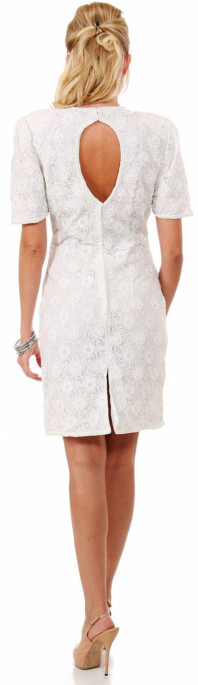 Miniature Floral Pattern Short Formal Party Dress with Keyhole. Floral pattern silk chiffon has beaded miniature flowers all over it. Round neck dress has half sleeves, shoulder padded & 37" in length. Keyhole at back with zipper closure & also a slit. Imported.
