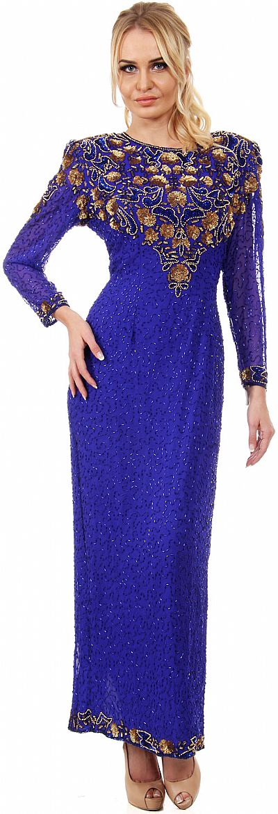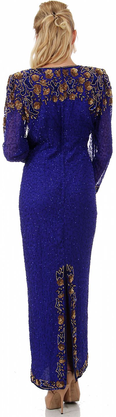 Artistic Sequins Pattern Full Sleeves Long Beaded Gown. Round Neck dress has long sheer sleeves with abstract floral pattern in sequins & beads on the front bodice, shoulders & back also. Hemline & slit at the back is also bordered with sequins design. 56" long dress has closed back with zipper closure & also shoulder padded. Silk chiffon with polyester lining. Imported.