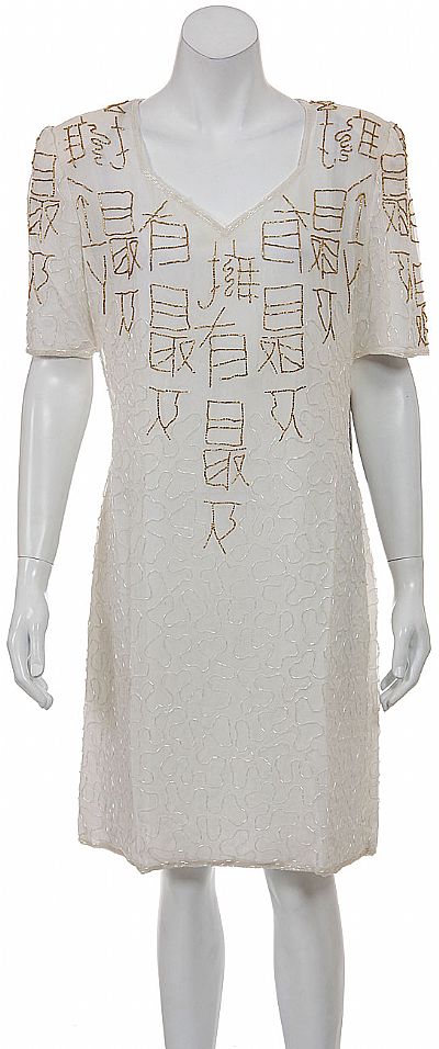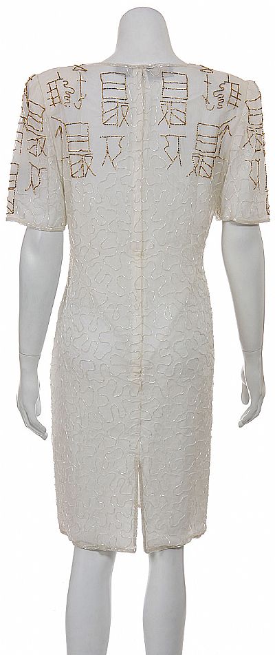 Short dress with hand beaded details on the bodice resembling asian characters. Short sleeved, shoulder padded and back zipper closure.