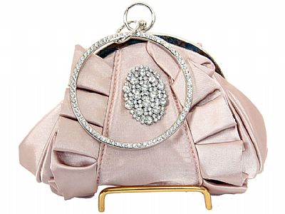 Elegant evening bag with pleating designs. Adorned with accentuating brooch filled with rhinestones. Bag has a rhinestoned studded bracelet as a handle. Measures: 8 x 5 x 2.5 inches