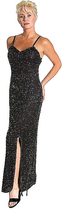 Spaghetti strapped full length Formal dress with maze shaped beaded pattern all over the dress. Back zipper closure. Natural silk (100%) chiffon hand-beaded dress with Polyester Lining. Slit on the side.