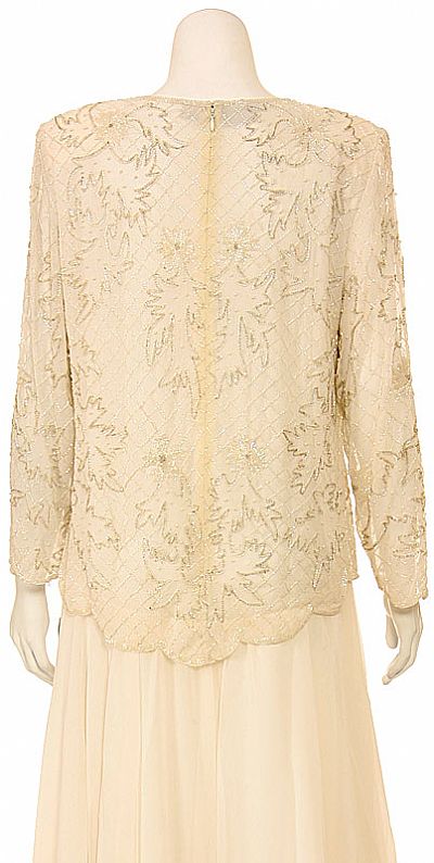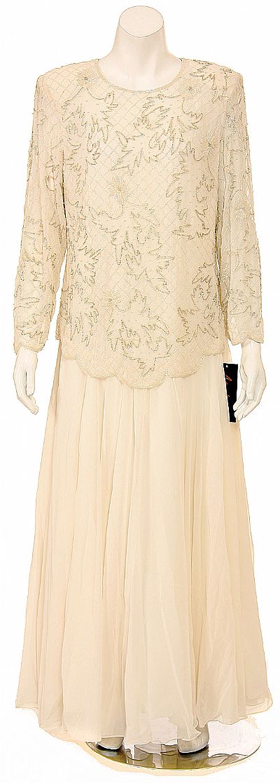 Two-piece look-alike full length gown made with a fully sequined beaded top. Assembled with long sleeves and a nicely designed cut along hem and sleeves. Free flowing skirt. Made of 100% Rayon.