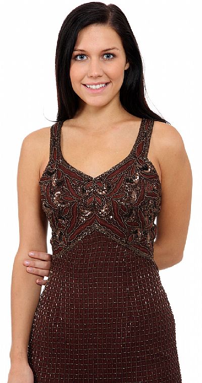 Boxy Beaded Formal Gown with Patterned Bodice  in closeup