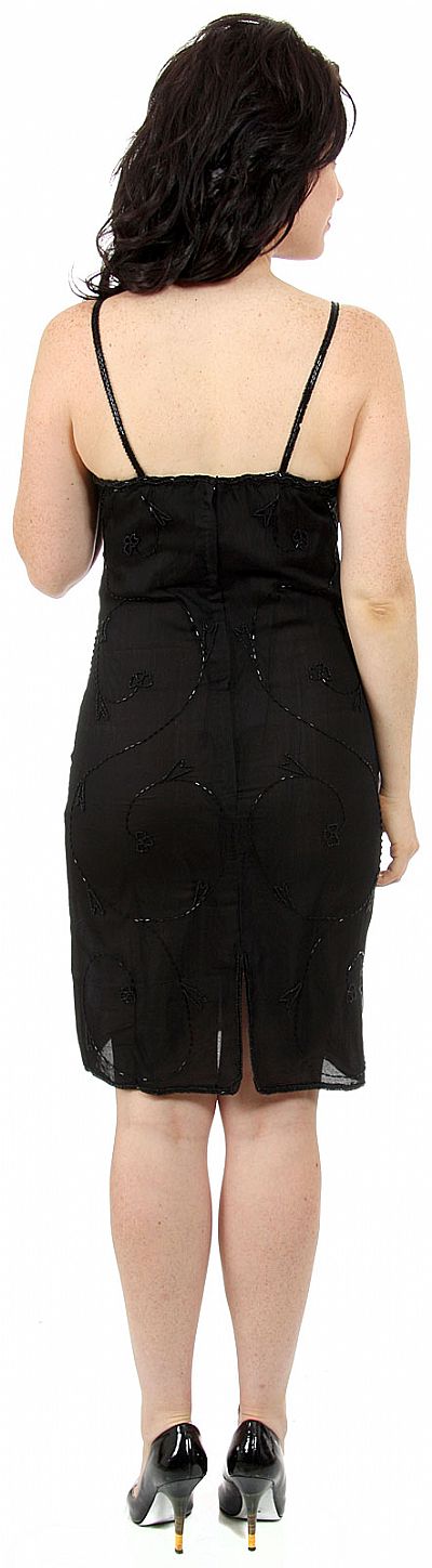 Spaghetti strapped v-neck dress with flower print swirls beading. Beading along top and bottom seam. Dress semi-transparent; recommend using a slip underneath dress.