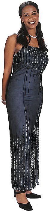Spaghetti strapped full length silk chiffon dress with front side slit. The dress has vertical beading pattern at the bodice and the bottom of the dress. 100% silk chiffon hand-beaded dress with polyester Lining. Imported.