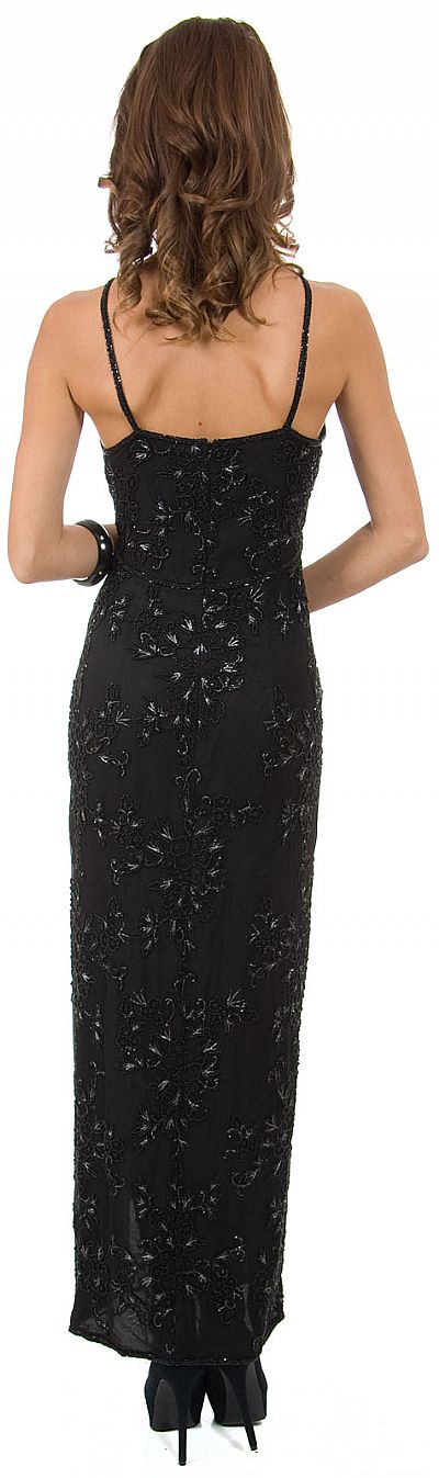 Boat Neck Floral Beaded Pattern Long Formal Evening Dress. Beautiful floral beaded pattern all over the dress with spaghetti straps at the back. Straight dress has front side slit for easy movement. Back zipper closure. 100% silk chiffon with polyester lining. Imported.