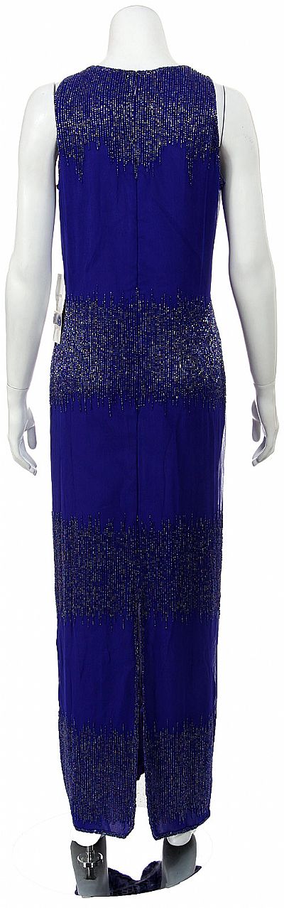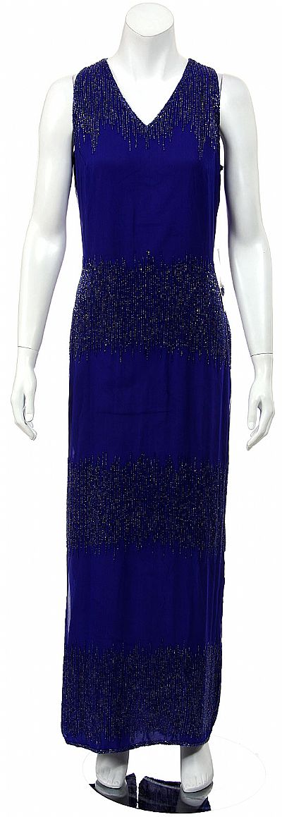 V-neck sleeveless beaded formal dress with closed back. Sparsely beaded pattern makes the full length dress very artistic. Long slit in the middle at the back of the dress. 100% Silk chiffon with polyester lining. Imported.