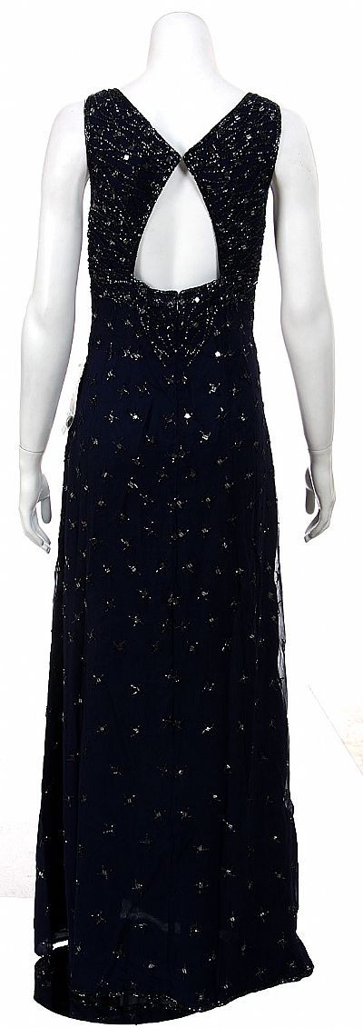 V-neck Full length beaded formal sleeveless dress with keyhole. Charcoal colored dense beading at the upper half at the front & back of the a-line dress. Back zipper closure with a triangle shaped keyhole at the back. 100% silk chiffon with polyester lining. Imported.