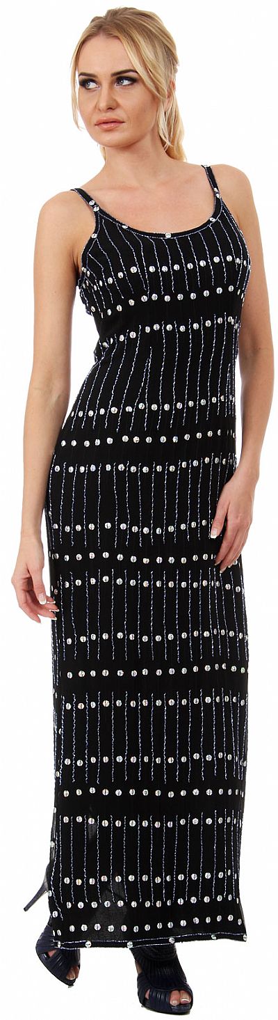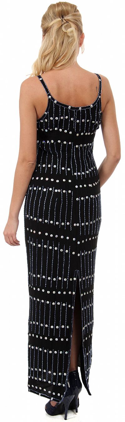 Geometric Beaded Pattern U-Neck Long Straight Formal Dress. Strands of beads make vertical lines pattern all over with big sequins in-between. Spaghetti straps dress has long slit at the back for easy movement & also zipper closure. 52" long silk chiffon dress with polyester lining. Imported.