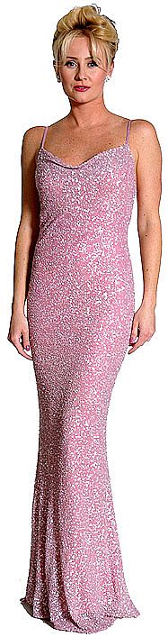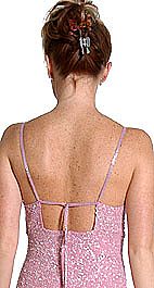 Sequined Cocktail dress with spaghetti straps and a flared skirt. Dress has a cowl neck with silver & white beading all over the dress. 100% natural silk chiffon with polyester lining. Dress has a low back with two straps with hook closure holding the dress together. Back zipper closure also.