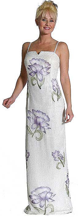 Square neck long Beaded cocktail dress with painted purple/green flowers all over the dress. Spaghetti strapped with back zipper closure & long slit at the back. Natural silk (100%) chiffon hand-beaded dress with Polyester Lining. Slit at the back.