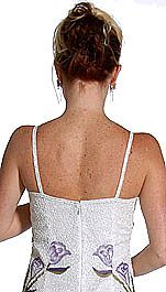 Square neck beaded long cocktail dress with painted purple/green tulips all over the dress. Spaghetti strapped with back zipper closure & long slit at the back. Natural silk (100%) chiffon hand-beaded dress with Polyester Lining. Slit at the back.