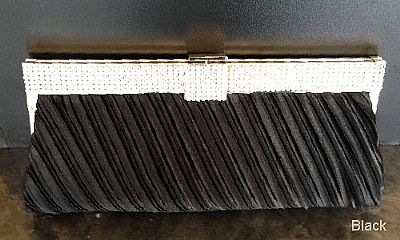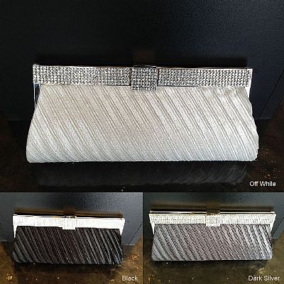 Diagonal Patterned Evening Bag with Metal Trim with Rhinestones. The polyester satin material bag has broad metal trim with rhinestones over it. Imported.