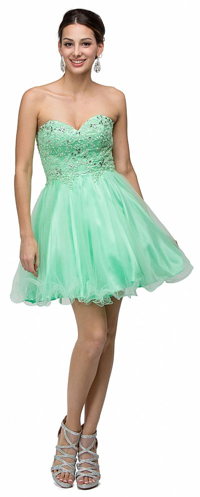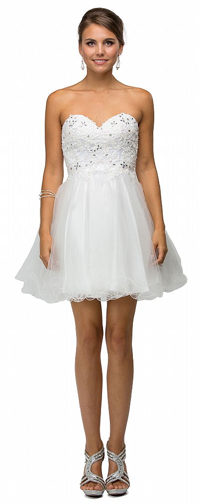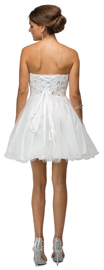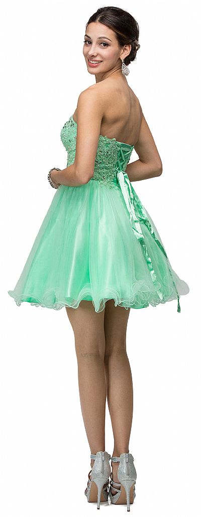 Strapless Lace Bodice Tulle Short Homecoming Party Dress. Sweetheart neck dress has floral lace on bodice embellished with rhinestones too. Multiple layers of tulle on the skirt with ruffled hemline. 27" long dress has lace-up back with bra cups too. Imported.