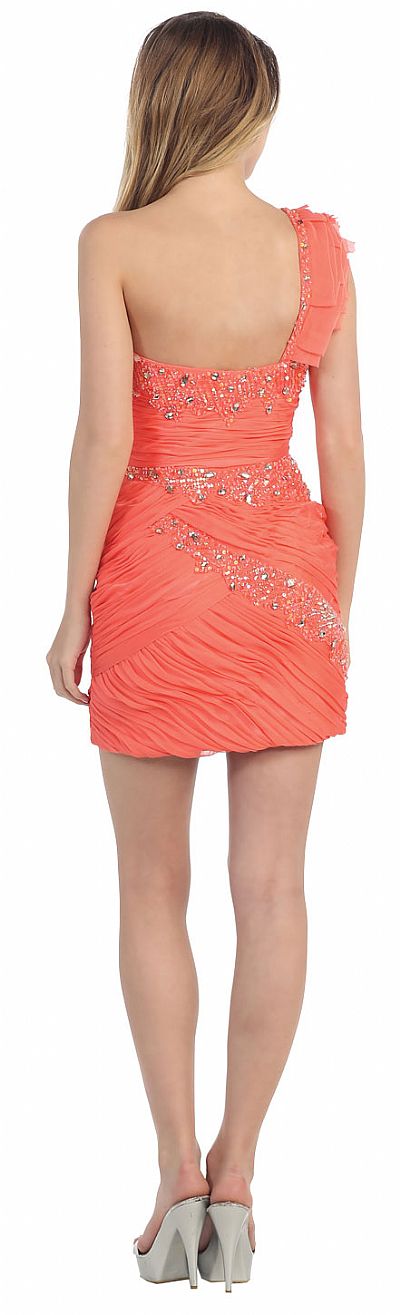 One Shoulder Beaded Bandage Design Short Party Prom Dress. Shirred all over with gaps filled with sequins & rhinestones decorating the neckline, waist & skirt also. Sweetheart neckline with layered patches at the shoulder strap with beading also. Side zipper closure. Imported.