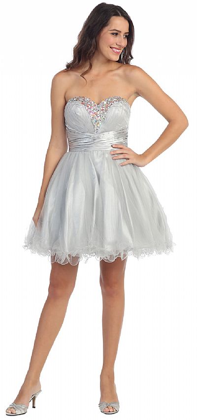 Strapless Sequined Bust Short Tulle Prom Party Dress in Silver