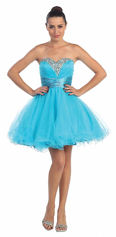 Strapless Sequined Bust Short Tulle Prom Party Dress in Turquoise