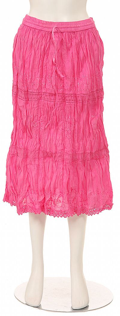 Tea length crinkled skirt embellished with a knit-like floral design throughout the center and hem. Free sized made with an elastic band. Made of 100% Cotton. Imported.
