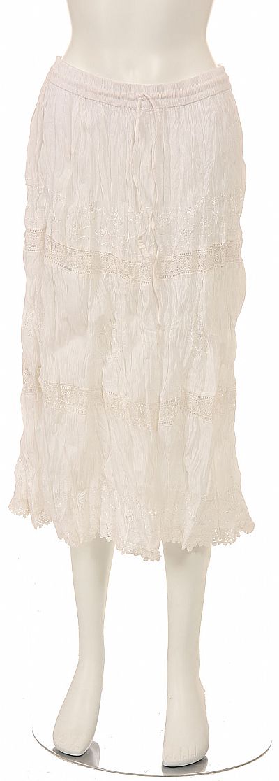 Tea length crinkled skirt embellished with a knit-like floral design throughout the center and hem. Free sized made with an elastic band. Made of 100% Cotton. Imported.