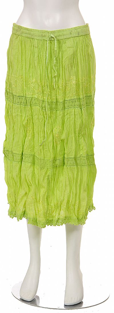 Tea length crinkled skirt embellished with a knit-like floral design throughout the center and hem. Free sized made with an elastic band. Made of 100% Cotton. Imported.