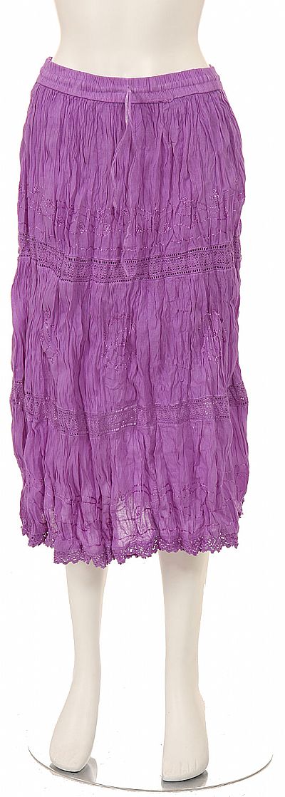 Tea length crinkled skirt embellished with a knit-like floral design throughout the center and hem. Free sized made with an elastic band. Made of 100% Cotton. Imported.