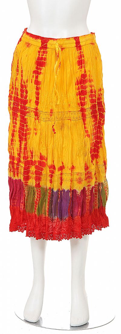 Tie & Dye Tea Length Crinkled Skirt embellished with lace horizontally & also on hem. Bold splash of colors in tie & dye pattern along the hem of the skirt. Free sized made with an elastic band & drawstring also. Made of 100% cotton. Imported.