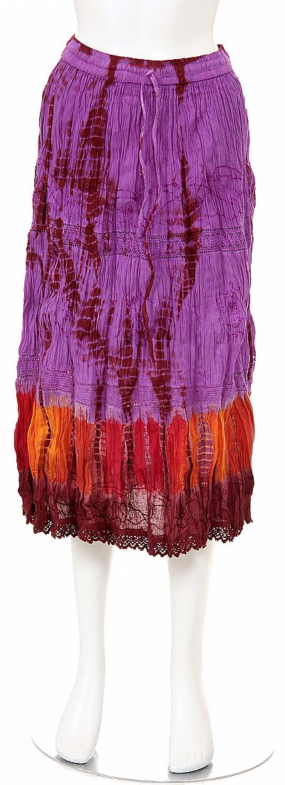Tie & Dye Tea Length Crinkled Skirt embellished with lace horizontally & also on hem. Bold splash of colors in tie & dye pattern along the hem of the skirt. Free sized made with an elastic band & drawstring also. Made of 100% cotton. Imported.