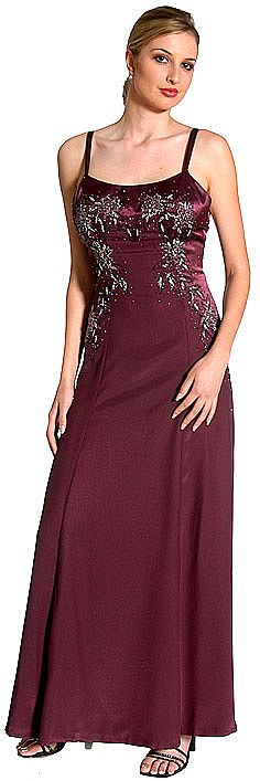 Spaghetti strap A-line beaded dress. Poly satin with polyester lining.