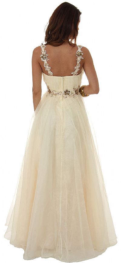 V-Neck Multi Layered A-Line Formal Prom Dress in Organza with Beaded Bodice. Bodice & shoulder straps are accented with beads and rhinestones in floral pattern. Bust is ruched and beading is extended to the back of dress also. Back zipper closure. Imported.