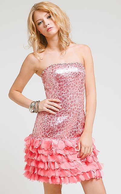 Strapless Short Sequined Cocktail Party Dress with Tiered Skirt. Bodice has small shining sequins which gives it a metallic look & there are studded stones along the neckline. Petals shaped cutouts in multiple layers gives the skirt a tiered look. Back zipper closure. Imported.