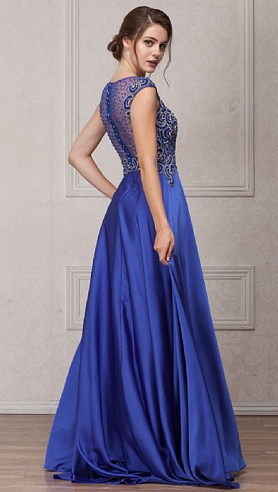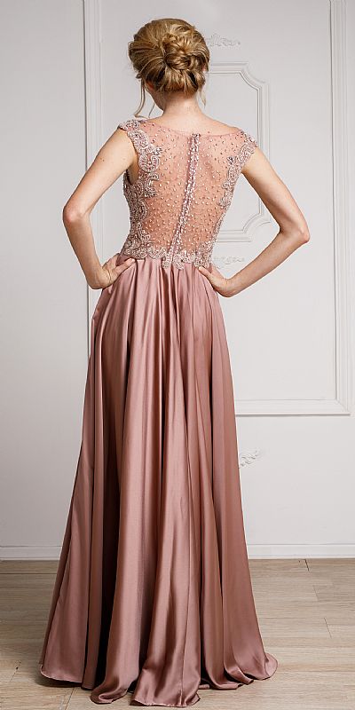 EMBELLISHED SHEER TOP LONG PROM PAGEANT SATIN DRESS (item #a238)