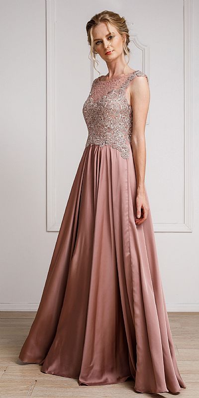 Embellished Sheer Bodice Poly Satin Long Prom Dress. Boat neckline sheer mesh bodice has an alluring pattern in sequins, beads & lace. Pleated poly satin floor length skirt adds glamour to this formal prom pageant dress. Sheer mesh back with sequins & zipper closure too. Imported.