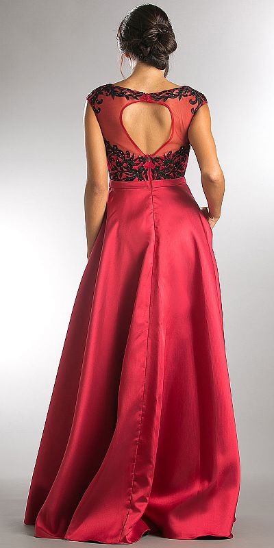 Boat Neck Mesh Embroidered Top Long Formal Evening Dress. Sleeveless dress has elegant embroidered pattern with little rhinestones over it. Belt accent on empire cut dress with a-shape puffy skirt. Sheer mesh around neckline & keyhole back with hook & zipper closure. Imported.