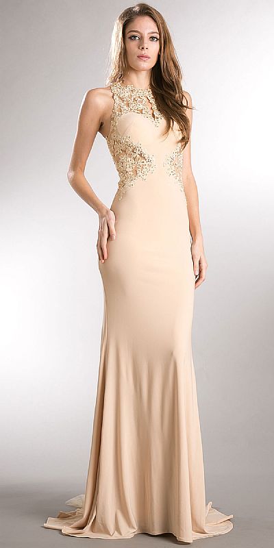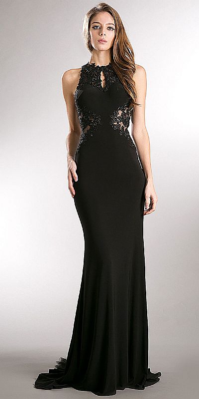 Beaded Lace Bodice Fitted Mesh Floor Length Prom Pageant Dress. Form fitting dress has sheer mesh neckline, waist & back embellished with floral pattern lace having rhinestones. Sleeveless dress has keyhole at front & back too with hook & zipper closure. Sheer rhinestones tulle train at the back of the flared skirt dress. Imported.