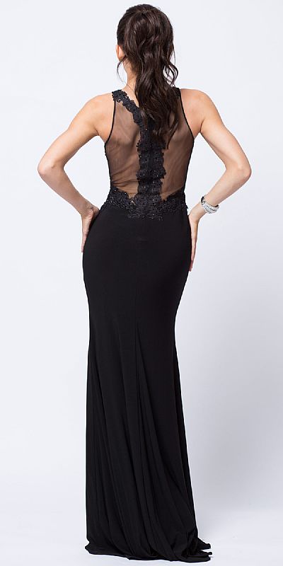 Sheer Waist & Back Fitted Long Formal Jersey Dress. Fitted jersey dress has sheer mesh at the waistline which gives the effect of a 2-piece dress. Bust & sheer mesh back adorned with lace motifs. Flared bottom with little train at the back too. Imported.