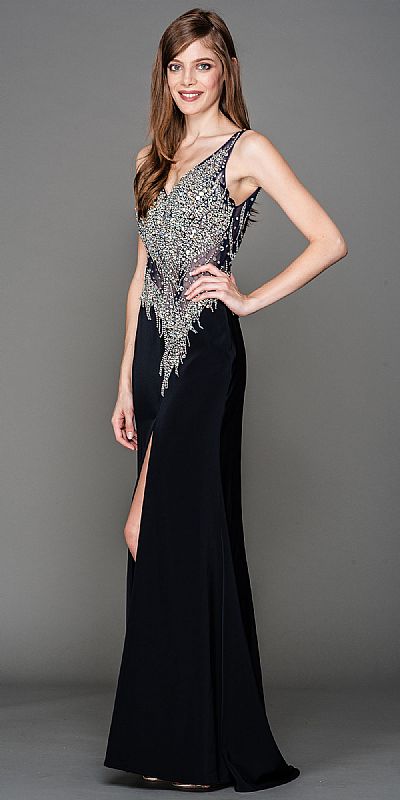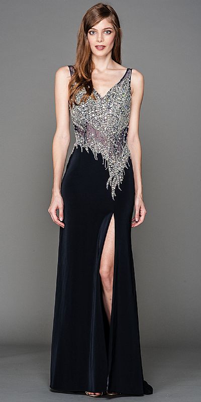 V-Neck Mesh Bejeweled Bodice Long Prom Pageant Dress. Sheer mesh bodice with rhinestones in varied sizes making an alluring pattern. V-neck sleeveless dress with sheer waist & back and long front side slit. Deep v-neck back with back zipper closure too. Imported.