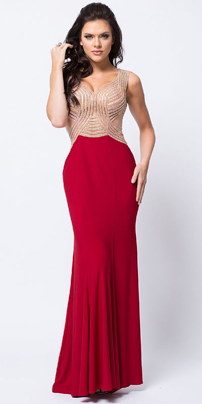 V-Neck Embellished Bodice Sheer Back Long Prom Dress. Sleeveless jersey dress has strings of rhinestones making an exquisite pattern all over the bodice. Sheer mesh back with square neckline & bra cups too. Fit & flare bottom skirt with little train at the back & back zipper closure. Imported.