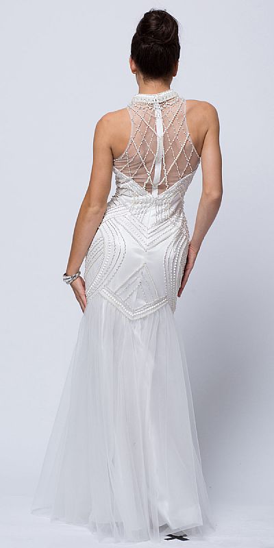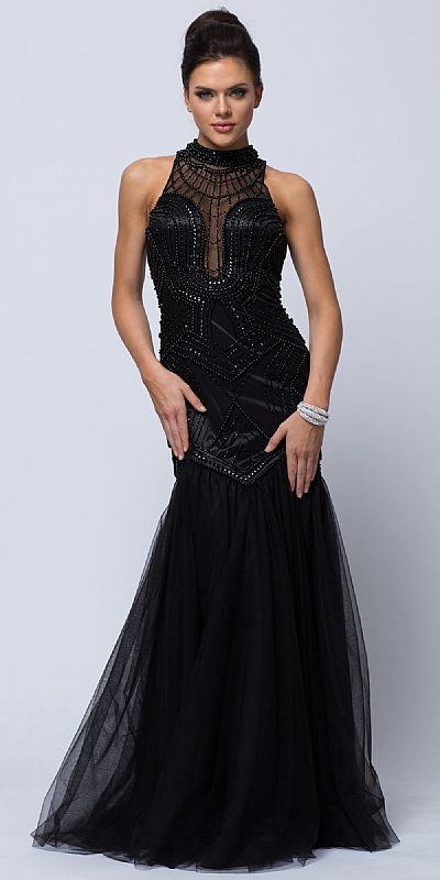 High Neck Beaded Bodice Mermaid Style Mesh Long Prom Dress. Stones, pearls & beads make an alluring pattern at the fitted mesh bodice with sheer mesh around bust. Sheer mesh back is also embellished with hook & zipper closure. Layers of mesh on the flared floor length skirt. Imported.