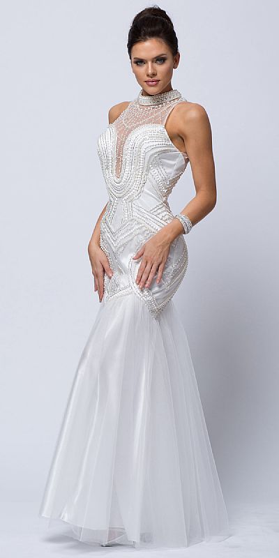 | HIGH NECK BEADED BODICE MERMAID STYLE MESH LONG PROM DRESS (item #a449)
