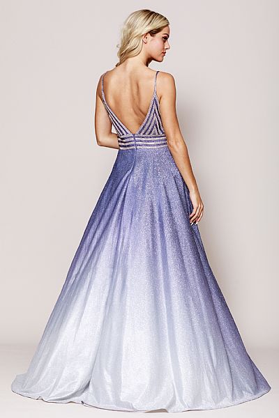 Empire cut prom gown with spaghetti straps. Open V shape back with zipper closure.