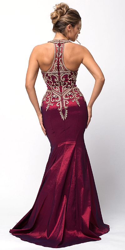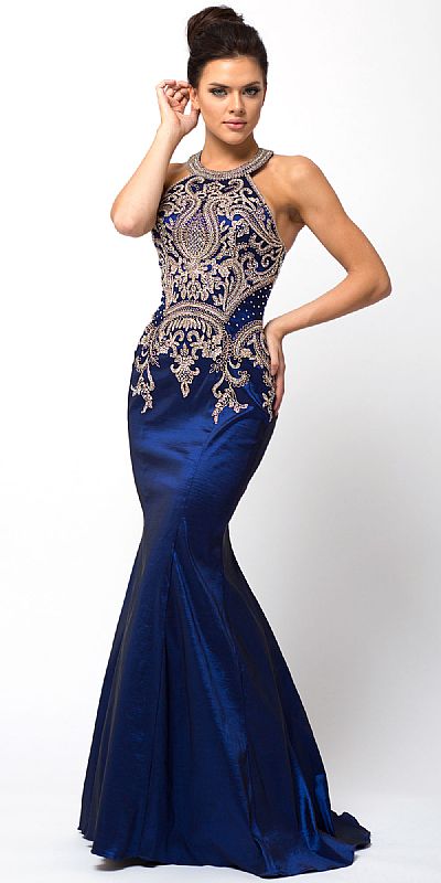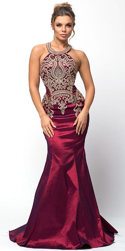 Embellished Bodice Round Neck Fit-n-Flare Long Prom Dress.Bejeweled lace & beads make an exquisite pattern all over the bodice at front & back. Halter round collar neck with hook & back zipper closure. Flared mermaid cut bottom with little train at the back too. Imported.