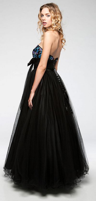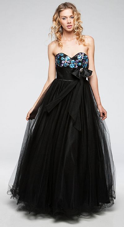 Strapless Sweetheart Neck Long Mesh Formal Prom Gown with Puffy Skirt. Sparkling sequins in multi colors make a floral pattern on bust. Broad pleated waistband in mesh with satin bow applique. Ruffled hemline multi layered mesh skirt is puffy & perfect for formal prom party. Imported.